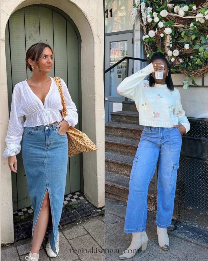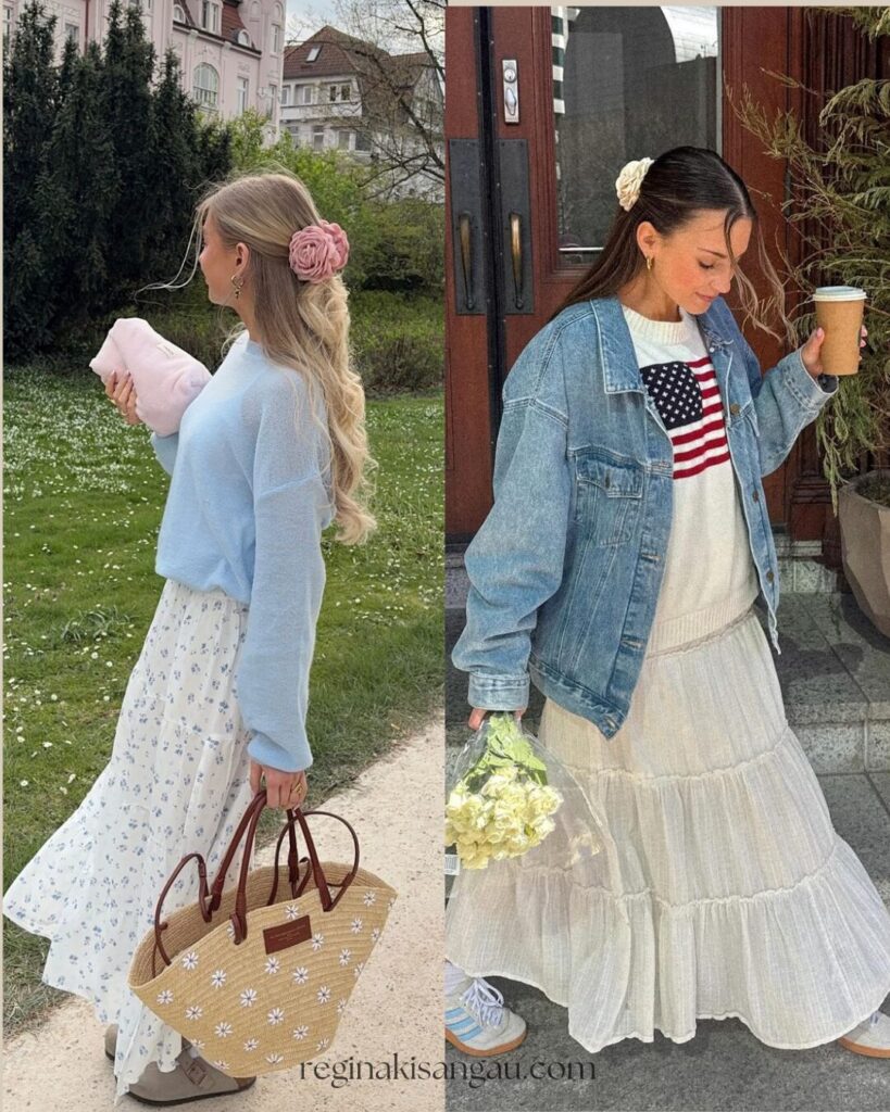 This outfit looks soft, simple, and perfect for early spring days. The pink sweater adds a pop of color, while the denim maxi skirt keeps the look relaxed and easy to wear. It’s an outfit that looks put together without trying too hard.